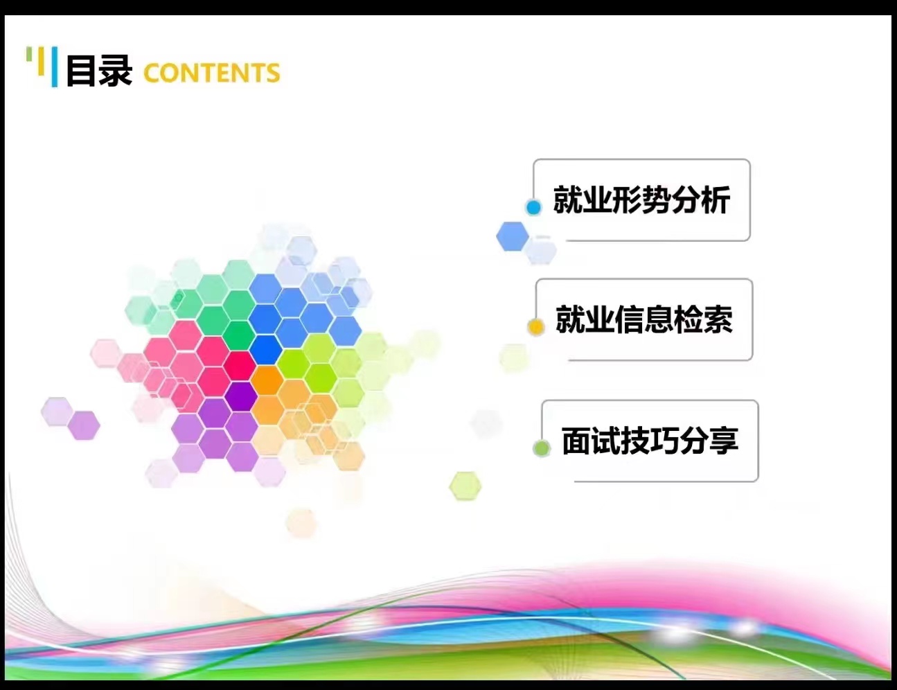 通过老师们的讲解,使同学们了解了出国留学的主要流程、国外课程考试体系、考研复试各个环节的准备、就业形势的分析、面试技巧等,为同学们指明了就业方向,树立正确的择业观,找准自身定位,极大增强了同学们的就业信心。