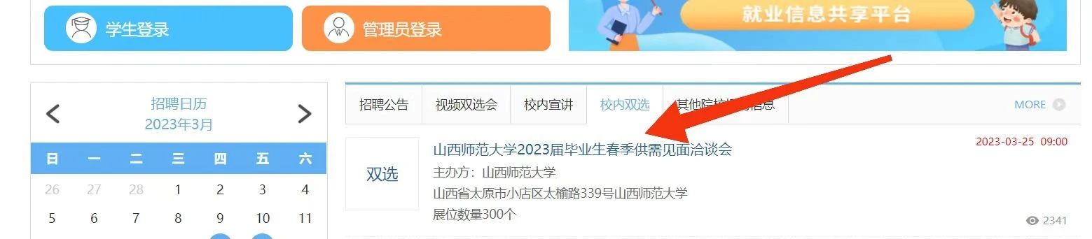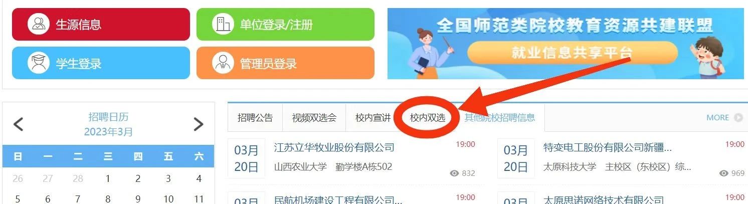 2、浏览器搜索打开EMC易倍官方网站就业信息网(http://sxnu.bysjy.com.cn/),进入页面后选择”校内双选”,点击“EMC易倍官方网站2023届毕业生春季供需见面洽谈会”即可进入双选会,进行电子简历投递。