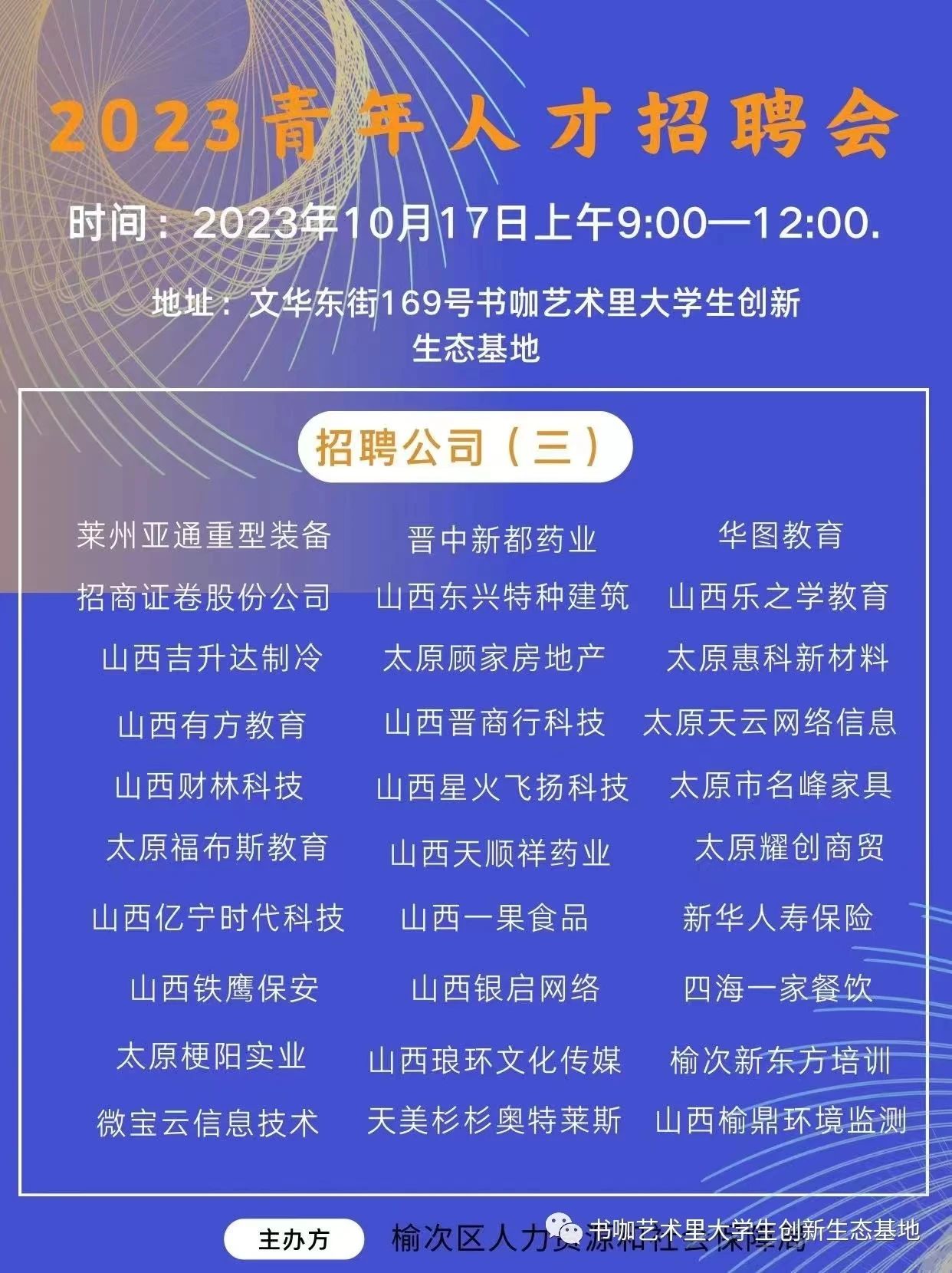 天美杉杉奥特莱斯、晋中仁和万达、梗阳实业集团、山西九州通医药、广源海汽车集团、爱尔眼科医院、顺丰速运、正大畜禽......百余家企业近2500个职位。