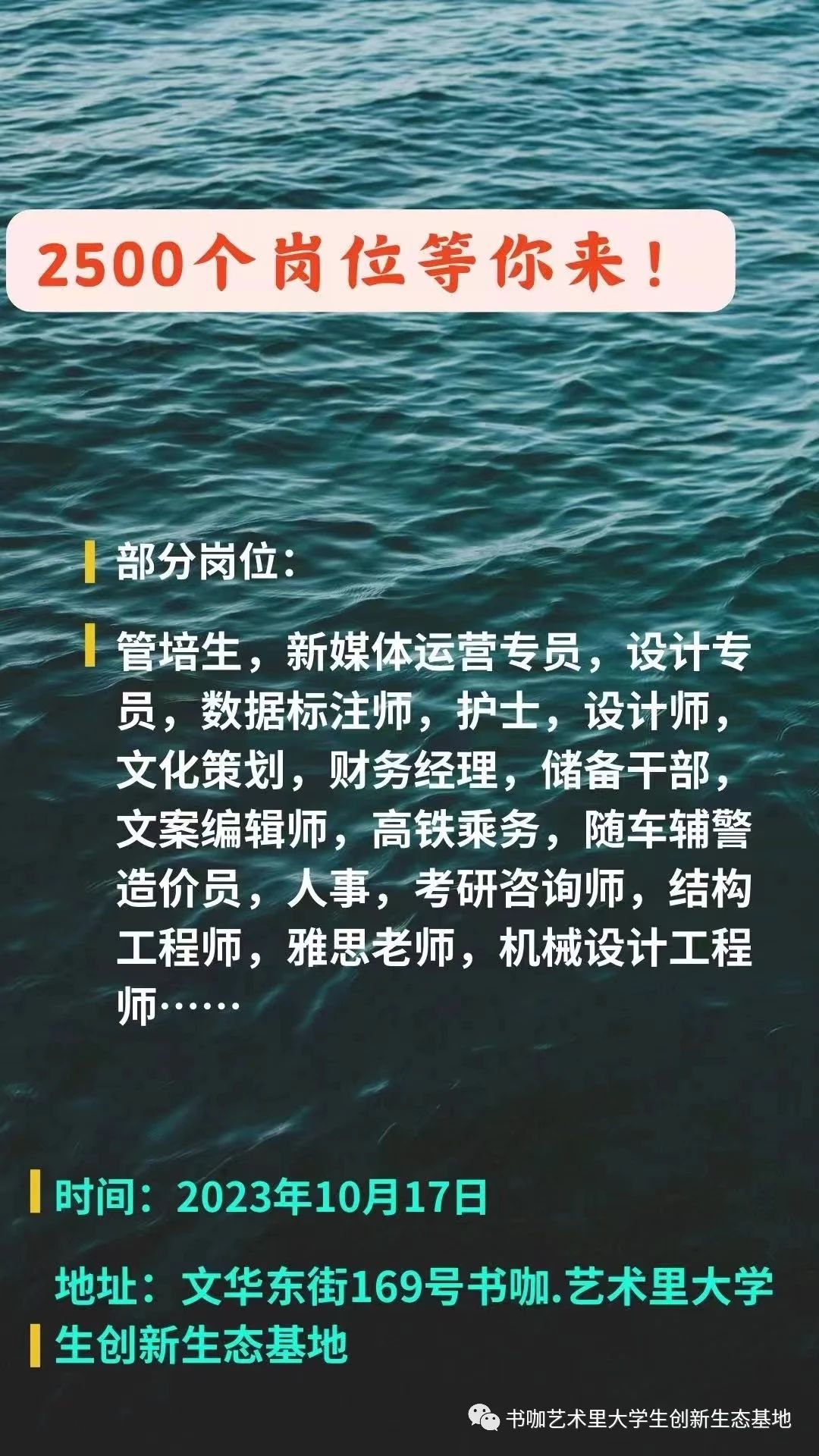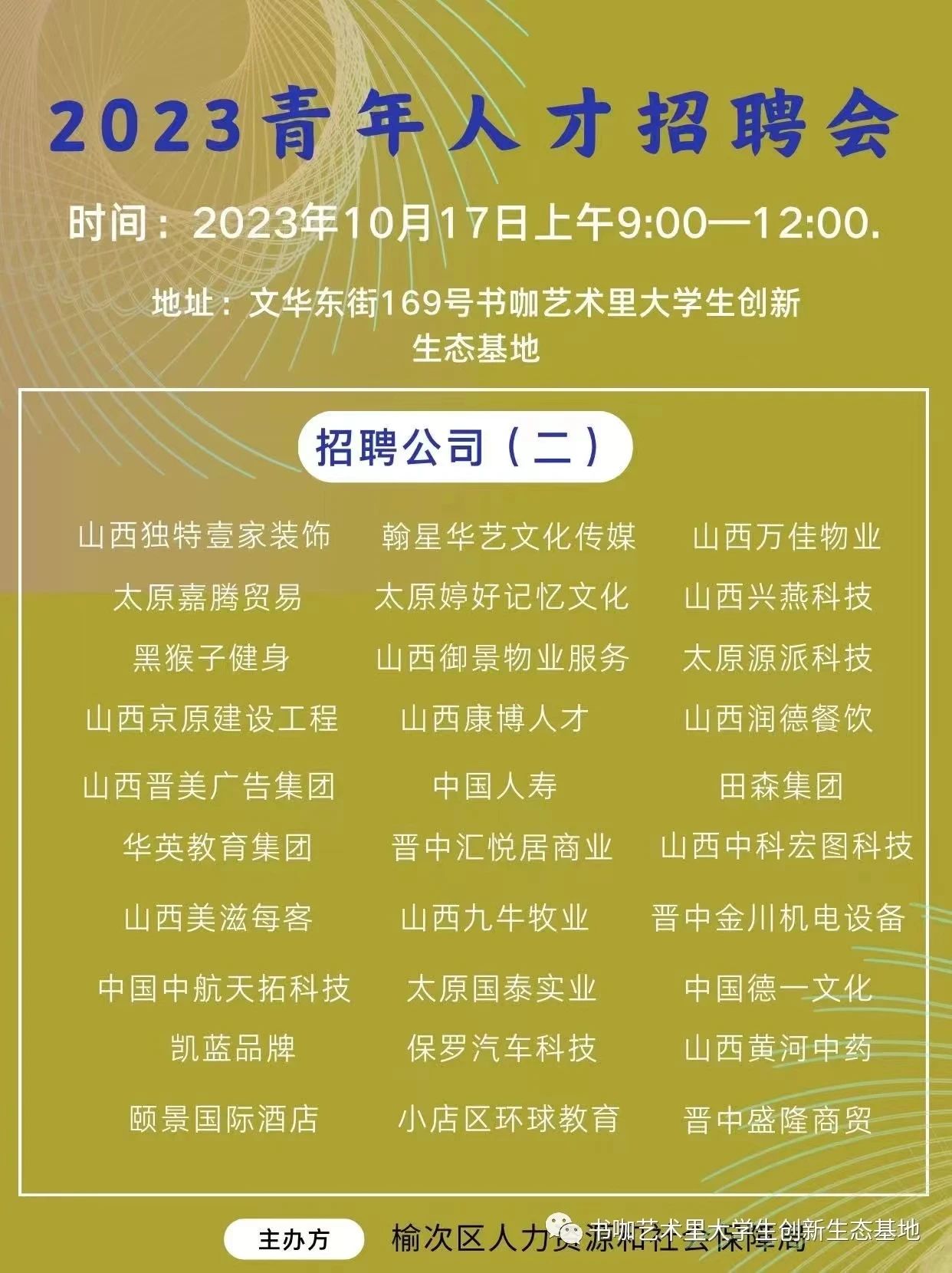 为全面贯彻党的二十大精神,深入落实党中央,国务院和省委,省政府关于高校毕业生就业工作的决策部署,促进高校毕业生高质量充分就业,将于2023年10月17日在文华东街169号,书咖·艺术里老员工创新生态基地举办【“金秋纳才·筑梦未来”2023青年人才大型招聘会】,诚邀您来参加选择适合自己工作实习的企业。