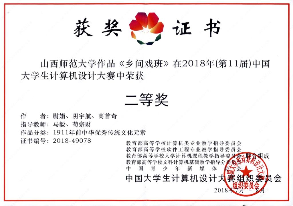 经过紧张激烈的角逐,尉娟、阴宇航、高首奇三位同学创作的作品《乡间戏班》荣获“1911年前中华优秀传统文化元素类”竞赛二等奖;刘东琴、王志茹、张鸿杰三位同学创作的《悠悠剪纸情》荣获“1911年前中华优秀传统文化元素类”竞赛三等奖。