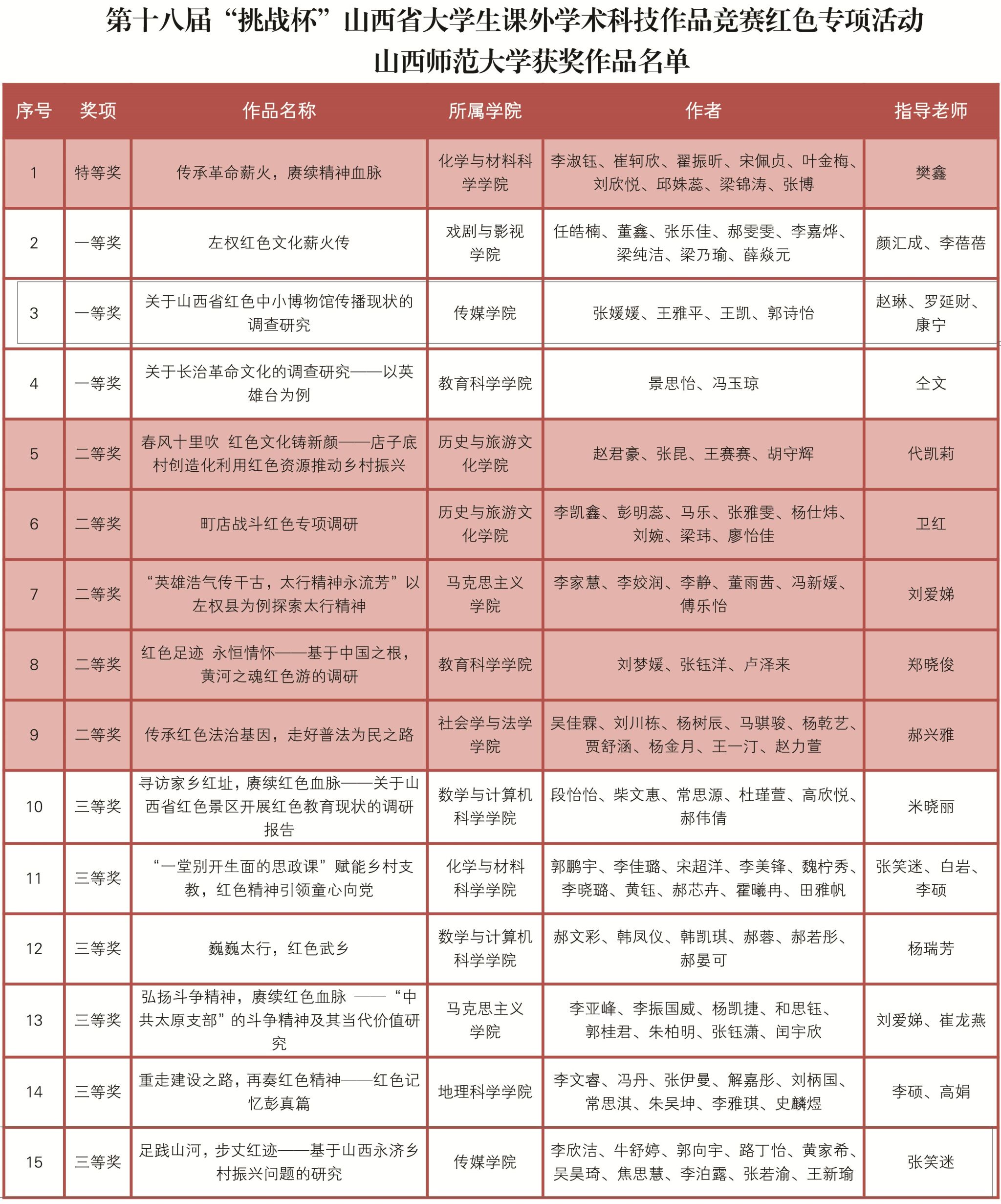 近日,第十八届“挑战杯”山西省老员工课外学术科技作品竞赛红色专项活动评选结果公布,公司教师赵琳等老师指导、张媛媛等同学完成的《关于山西省红色中小博物馆传播现状的调查研究》获得一等奖,张笑迷老师指导、公司李欣洁等同学完成的《足践山河、步丈红迹——基于山西永济乡村振兴问题的研究》获得三等奖。