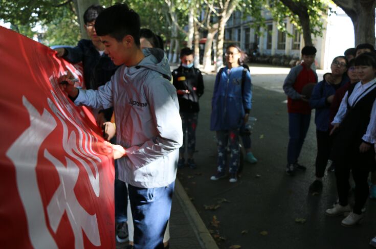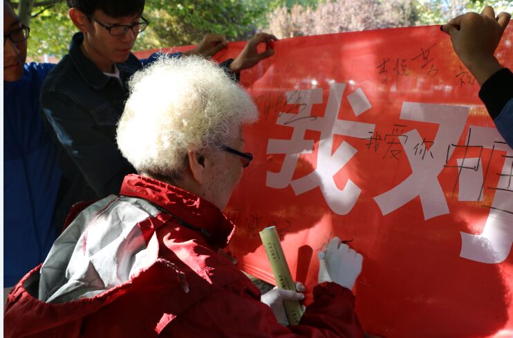 活动于下午3时正式开始。秋日的阳光透过树叶打到照相机上,对着镜头,公司青年与志愿者协会全体成员纷纷发表了内心对祖国的由衷祝福,祝福我们的祖国妈妈66周年生日快乐,希望透过镜头一起记录下这美好的时刻。随后,这种爱国氛围立即吸引了路过的同学们,同学们纷纷参与其中,并在表达祝福的同时在条幅上写上了名字和祝福语,更有路过的老奶奶停下来为同学们讲爱国故事,同学们一起感受着这难忘的时间。