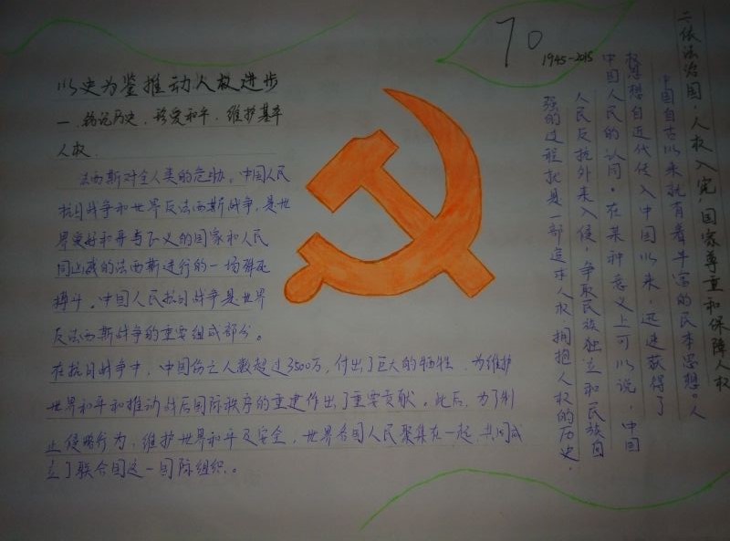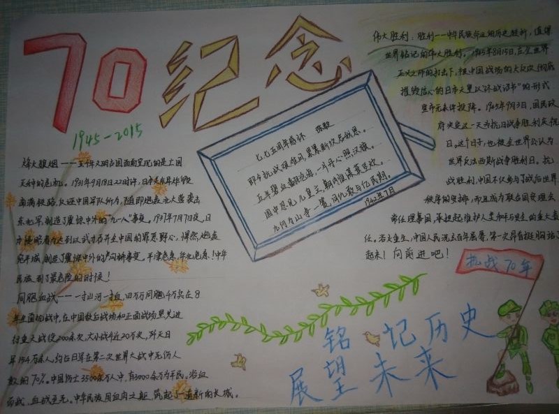 纪念活动在各班以不同的形式呈现,活动内容丰富多彩,有些 班级开展“牢记历史,勿忘国耻,珍爱和平,开创未来”主题班会,有些组织观看抗战类的相关视频,在观看视频的过程中中,同学们纷纷表现出对抗日英雄的敬畏感激,增强了其爱国主义意识,有的班级则结合“手抄报”,“黑板报”,PPT展示等多种形式开展纪念活动,介绍了有关中国共产党的基本情况以及在抗日战争中,革命先辈的光荣事迹。