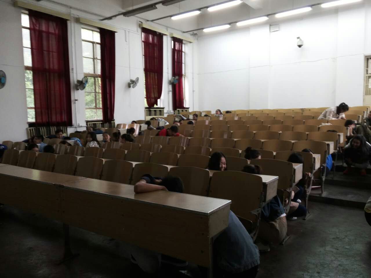 随着一阵急促的地震警报声响起,同学们在员工干部的指挥下,首先在桌子底下进行了一段时间的躲避,之后在确定安全后,同学们将准备好的湿毛巾捂住口鼻,并弯着腰迅速、有序地从教室向巨人广场撤离,用时2分40秒,整个活动安全有序,取得了预期效果。