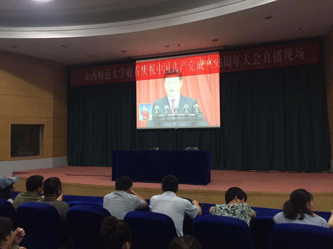 在科学会堂二层报告厅,全院师生党员、入党积极分子通过大屏幕共同观看电视直播,喜迎建党95周年。师生们聚精会神、仔细聆听、认真笔记、情绪高涨,不时对习近平总书记的讲话报以热烈的掌声。