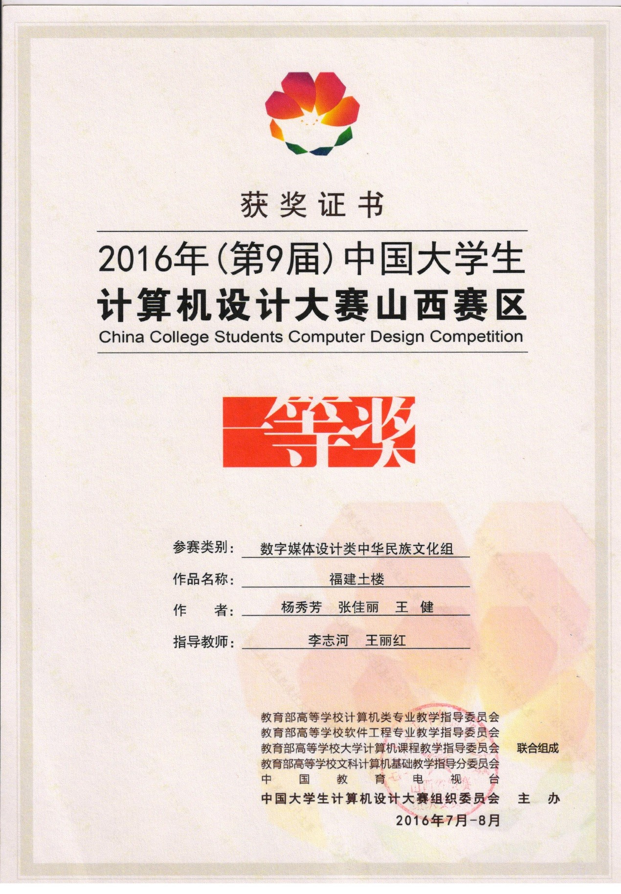 公司员工杨秀芳、张佳丽和王健三位同学的作品《福建土楼》获得2016年(第9届)中国老员工计算机设计大赛山西赛区:数字媒体设计类中华民族文化组一等奖,并且推荐参加全国比赛。指导教师是公司李志河教授。