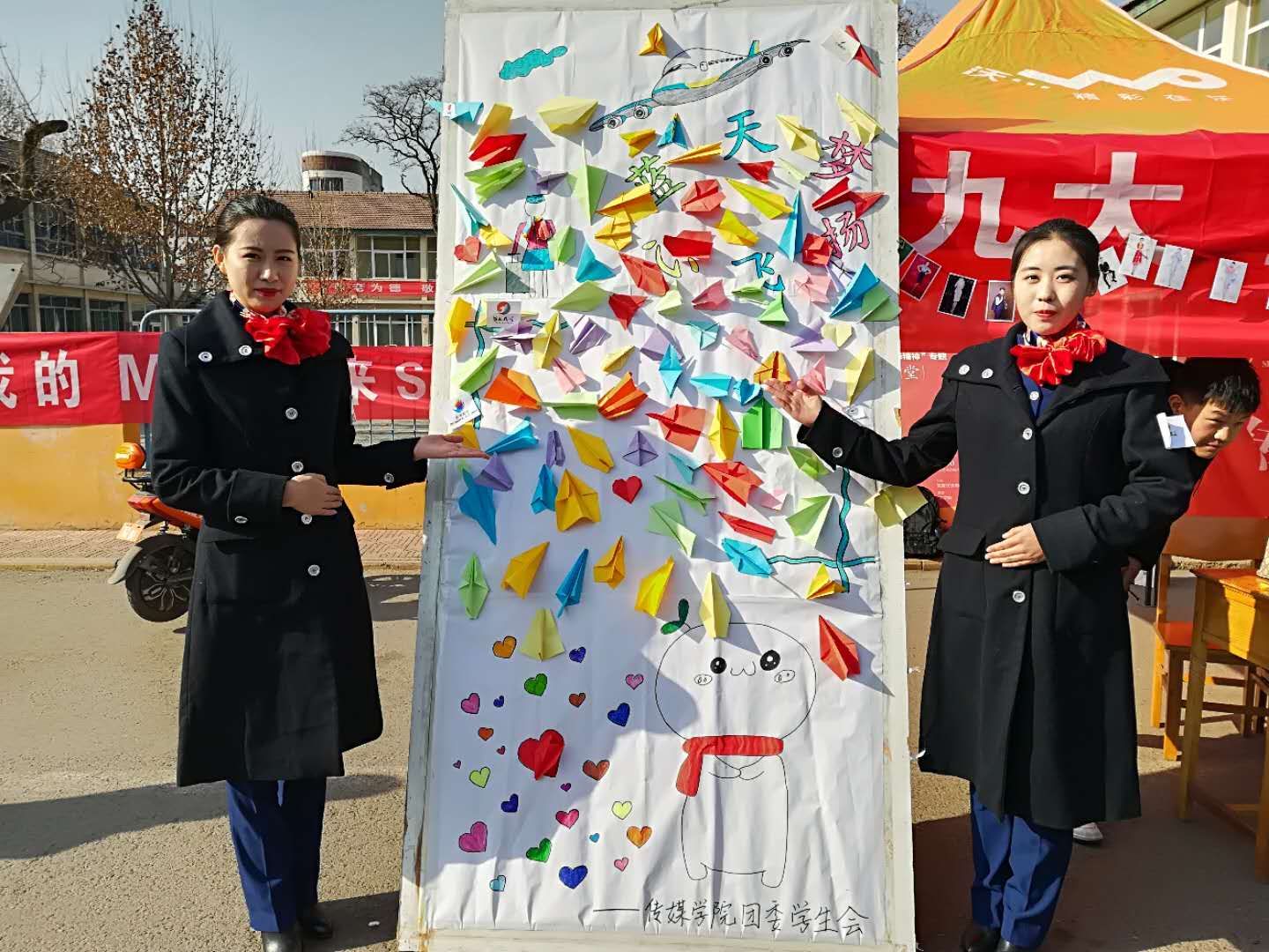 活动中,员工会成员向来往同学们发放了彩印航空标识,为参与活动的同学宣讲普及了航空历史以及飞行安全知识,引起了同学们的极大兴趣。之后,同学们用彩纸折出他们心中飞机的样子,折好之后并用双面胶粘在活动展板上,以此种趣味性较强的方式表达了对民航的敬意,献上自己对民航的祝福。