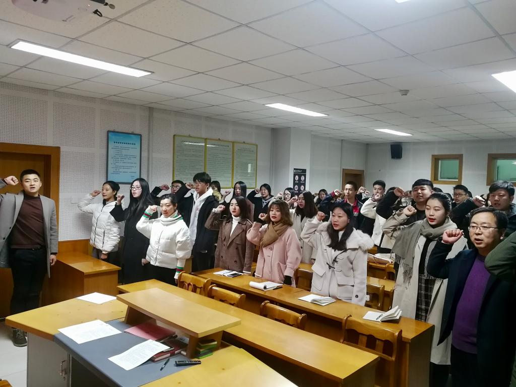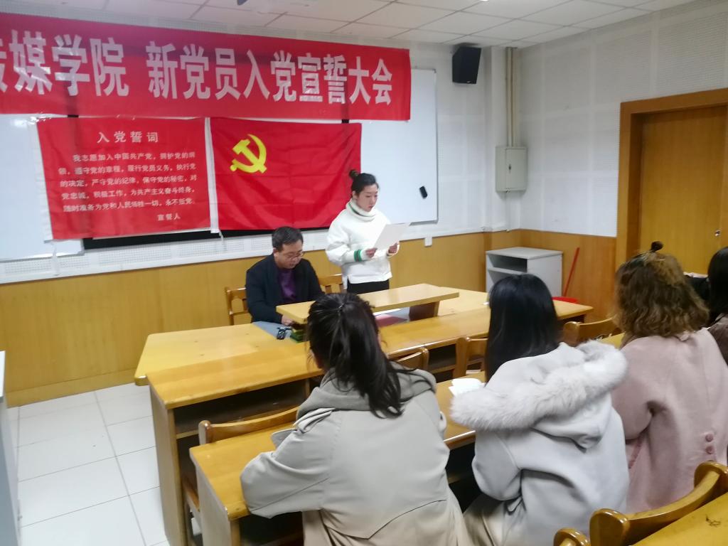 新党员代表张佳钰同志作表态发言。她表示要从加强理论学习、起到带头作用、认清自我定位三个方面认真履行党员义务,学习并贯彻落实党的十九大精神,提高自己的党性修养,自强不息,恒志笃行,给同学们做出好榜样,争当先锋模范。