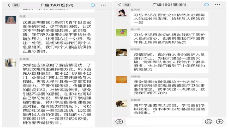接着,同学们围绕“新时代新青年如何练就过硬本领、服务基层群众”主题,结合抗疫期间的所见所感,畅所欲言,积极发表了自己的看法和见解。张彤分享道,我们要认真学习,把学习当成一种责任,一种追求,用自己所学的知识服务大众,紧跟时代潮流,让自己的思维和能力跟得上时代发展的步伐。我们更要承担社会责任,在奉献中实现自己的人生价值,正如习近平总书记所说那样,我们要为建设社会主义强国付出自己的力量。杨鹏表示,经历过此次疫情,作为新时代的青年我们也应该更加努力的提高自己,以担时代大任。我们应该加强责任担当新能力,做脚踏实地的行者。锻炼自我调整新能力,做敢于挑战的强者。锻炼变势抓势新能力,做敢于担当的勇者。支部成员感触良多,活动气氛十分热烈。