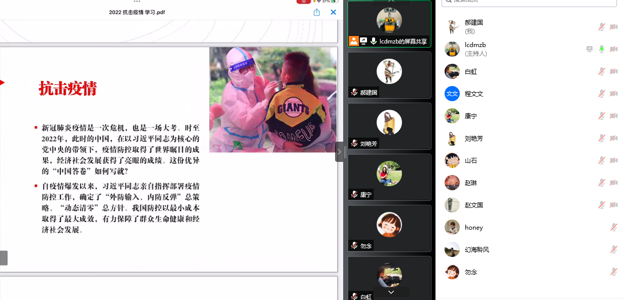 随后,管志涛老师在线讲述了4月初以来她在校内担任抗疫志愿者的经历。在校外的教师真切了解了近期在校教职工全力投入抗疫,确保员工身心安全、努力保障教学工作正常进行的基本情况。通过讨论,大家对在校教职工的尽心尽力、无私奉献表达了敬意,对师生团结、共克时艰的师大抗疫精神点赞。会上,支部书记郝建国根据公司文件,就下一步的防疫抗疫做了工作部署,要求所有党员树立“防疫重任、人人有责”的责任意识,要在抗疫工作中做好表率,积极配合公司工作部署,危险时刻能冲锋在一线。