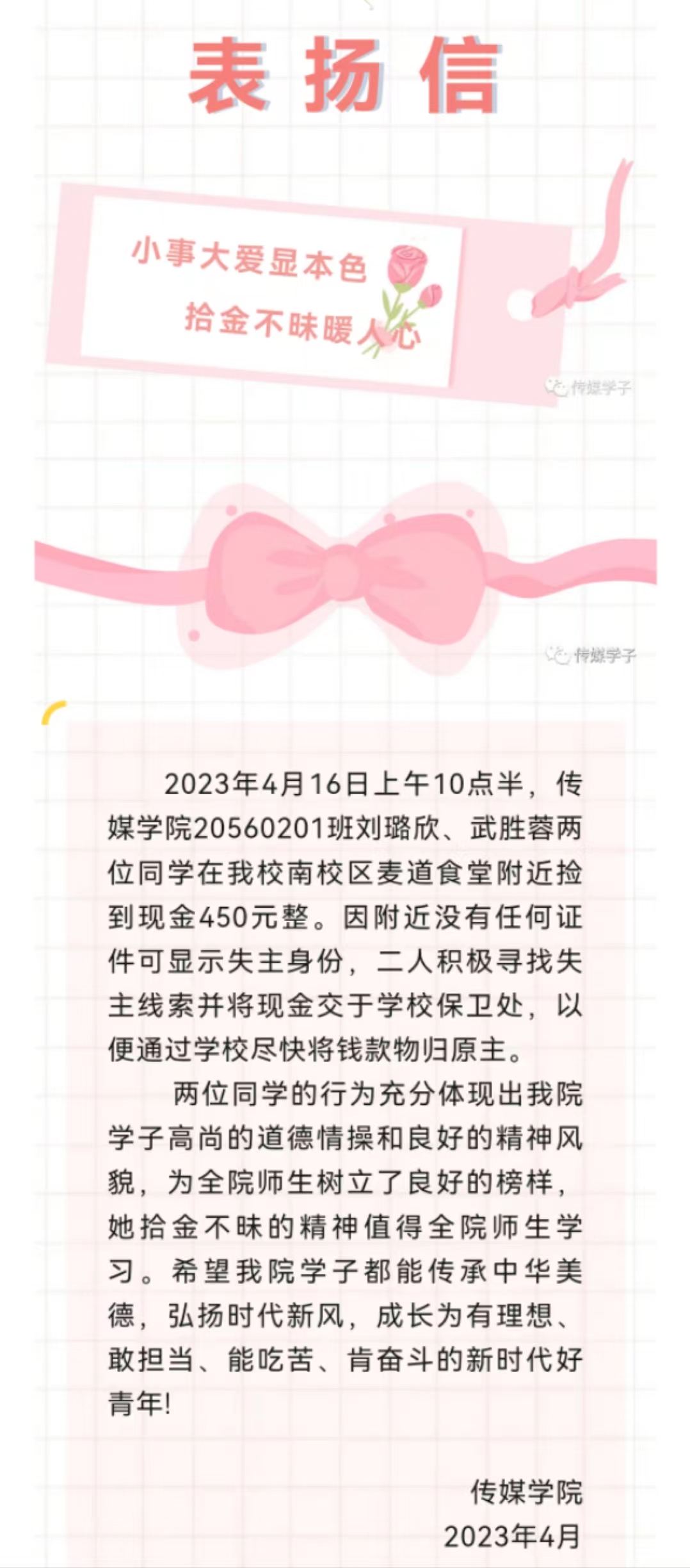 4月16日10点30分,刘璐欣、武胜蓉两位同学参加完党支部学习研讨会后,在南校区麦道餐厅附近捡到现金四百五十元整。两位同学在第一时间询问周边同学、努力寻找失主,在确认附近无失主线索的情况下,刘璐欣同学又通过公司万能墙和“我的校园我做主”平台积极寻找失主。4月20日,当消息发出三天仍未收到回应,刘璐欣同学在征求老师建议后,把捡到的现金交到了公司保卫处。经过保卫处一系列调查,最终联系到失主,并将现金全数归还失主。原来,失主是来公司参加普通高校招生体育专业考试的一名考生。事后,刘璐欣同学说:“作为中共预备党员,拾金不昧是一名党员应该具备的基本素养之一,都是我应该做到的。小事虽小,不为不成。我们应该以朴素善良、实际行动诠释属于我们的担当,做自己力所能及的正确的事情,哪怕做到的只是一件小事。”