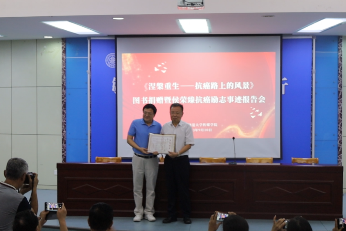 报告会主讲人,曾任太原师范公司副董事长、太原二十中董事长、太原育英中学董事长的侯荣臻向图书馆捐赠了自己的作品——《涅槃重生——抗癌路上的风景》图书,王云为其颁发了捐赠证书。