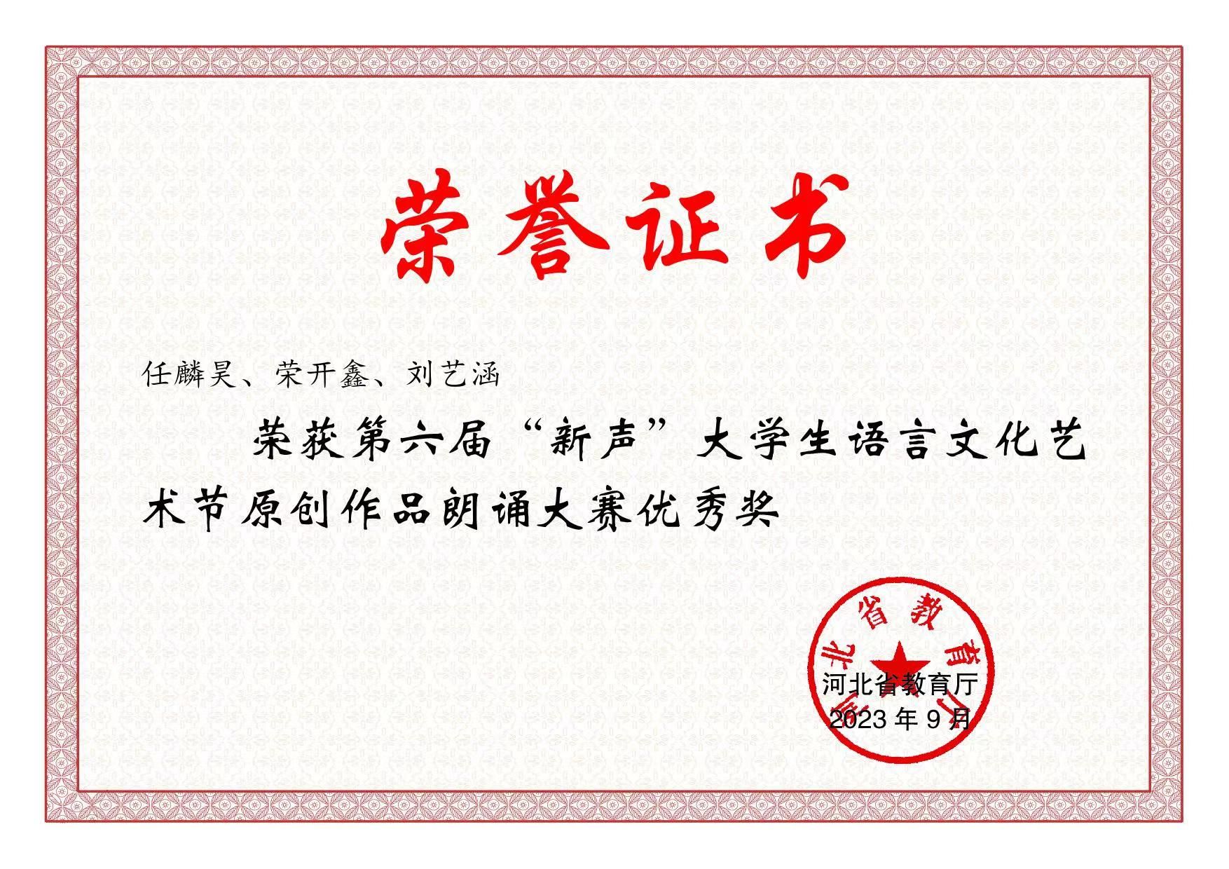 9月10日下午,第六届“新声”老员工语言文化艺术节原创作品朗诵大赛在河北大学落下帷幕。公司播音与主持艺术专业员工任麟昊、刘艺涵、荣开鑫的作品《血色城防图》入围复赛并最终获得优秀奖。