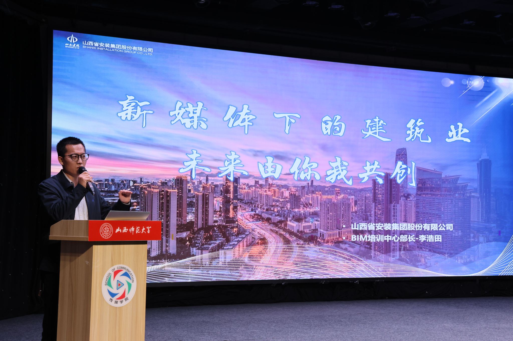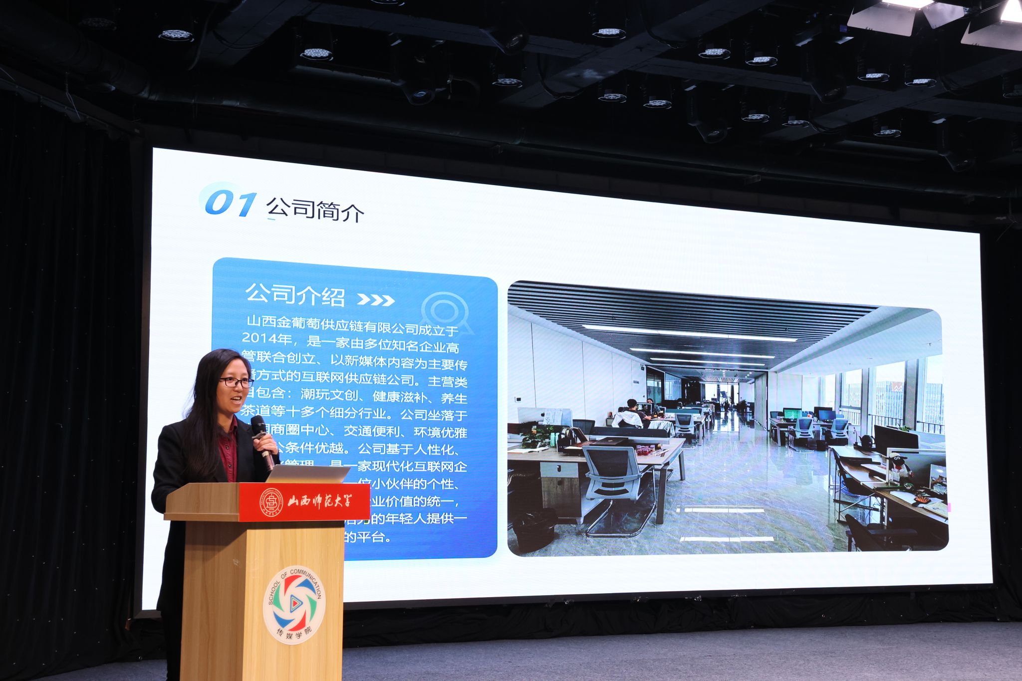 山西广播电视台市场运营中心副主任郭伟威、山西省安装集团股份有限公司BIM研究院李浩田部长、山西金葡萄供应链有限公司行政总监唐俊香、方塘云影(山西)文化传媒有限公司执行总监薛炀分别向同学们介绍了各自单位具体情况和实习工作要求。