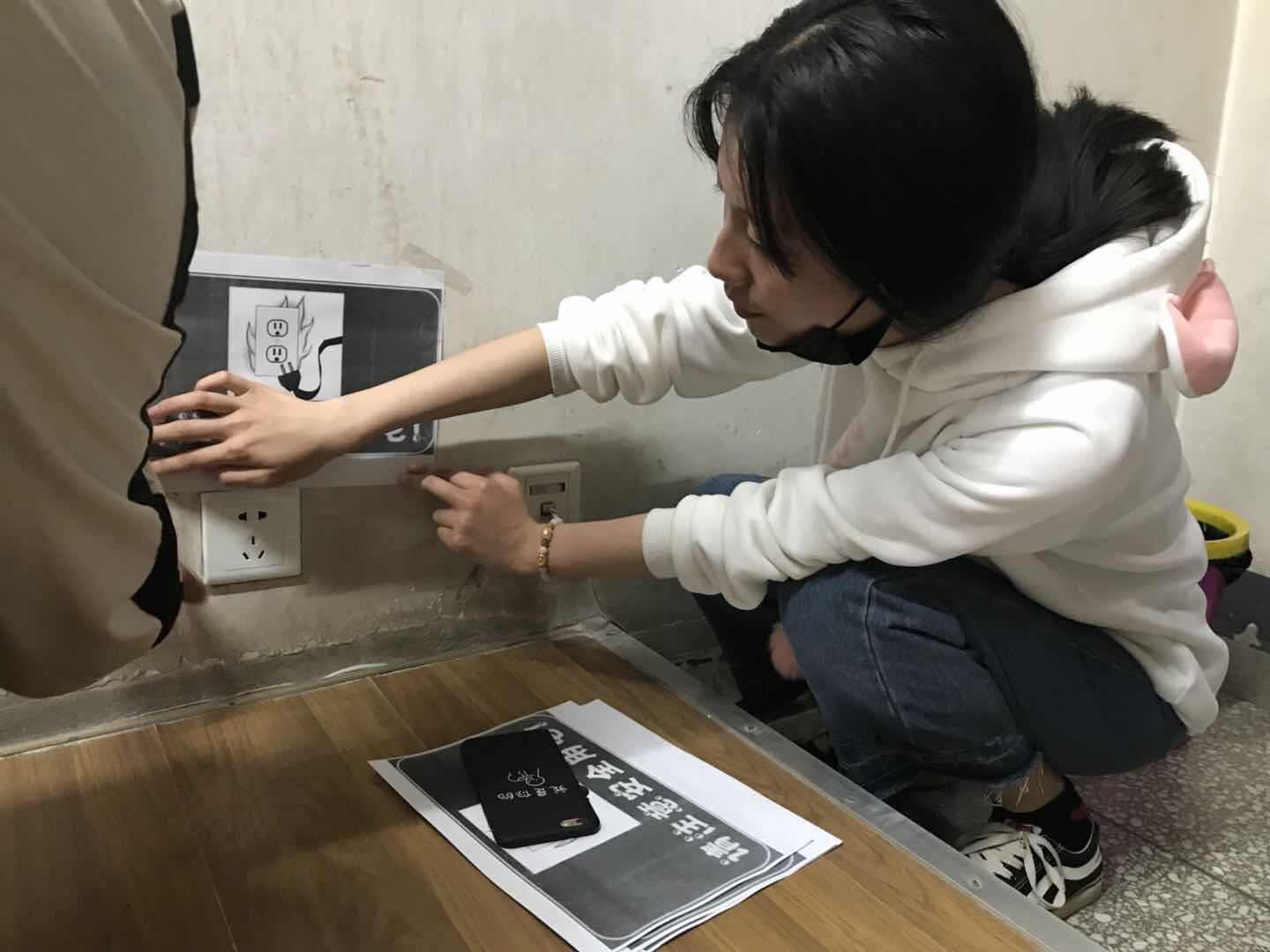 活动开始前,全体成员在科学会堂前集合,大家列队抵达莳英园。活动负责人将大家按小组划分,为各小组下发了安全标识、剪刀和胶带。团委员工会成员在10、11、12号教学楼的每个教室内,在电源旁张贴安全用电标识的活动,以达到警示的作用。同学们表示,用电无小事,安全很重要,希望可以通过此次张贴标识起到安全用电警示作用。