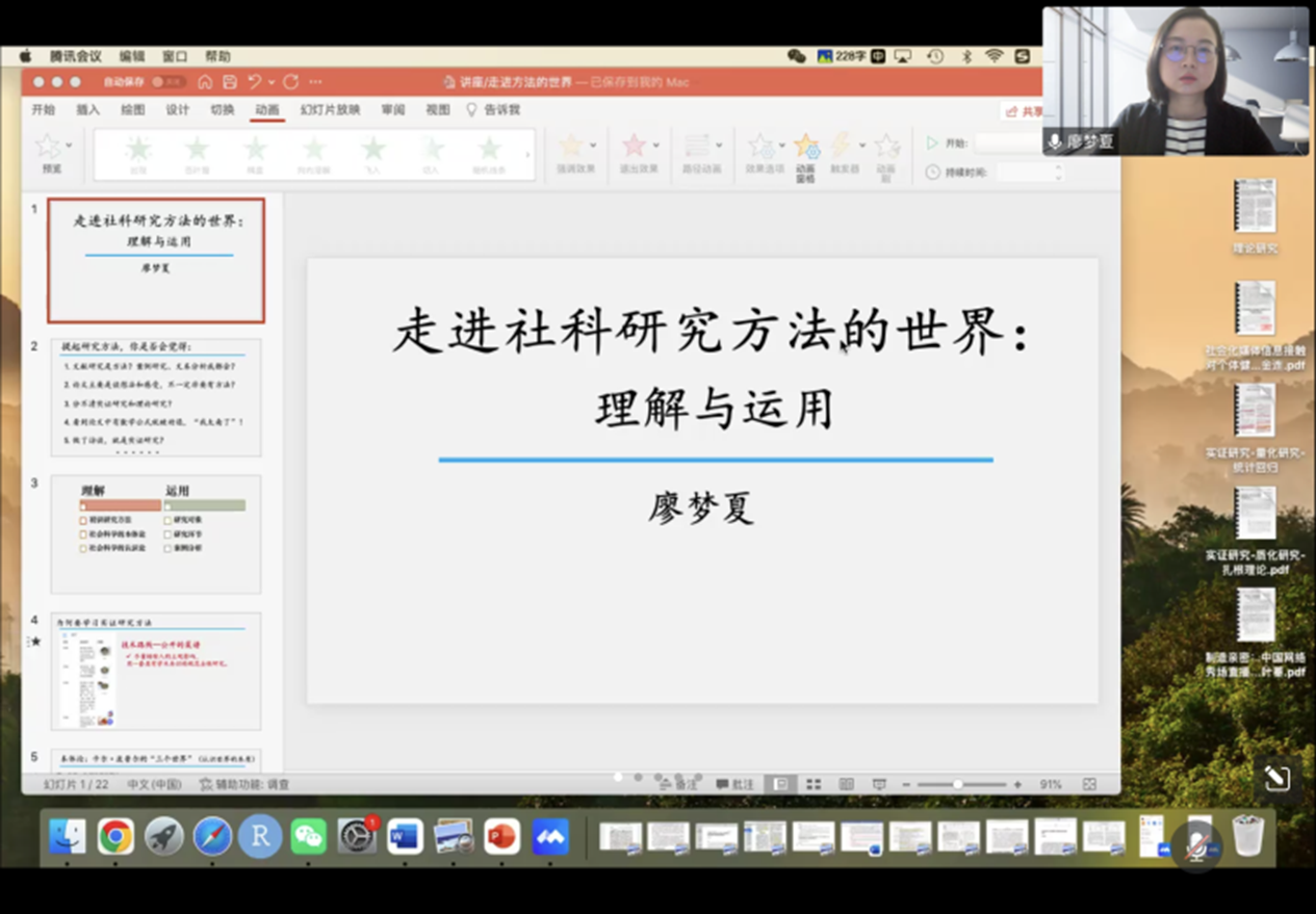 2022年11月11日19时,公司特邀四川外国语大学新闻传播公司廖梦夏副教授作了题为《走进社科研究方法的世界:理解与运用》的线上讲座。会议由emc易倍白岩老师主持并作总结发言,emc易倍部分师生参加本次讲座。