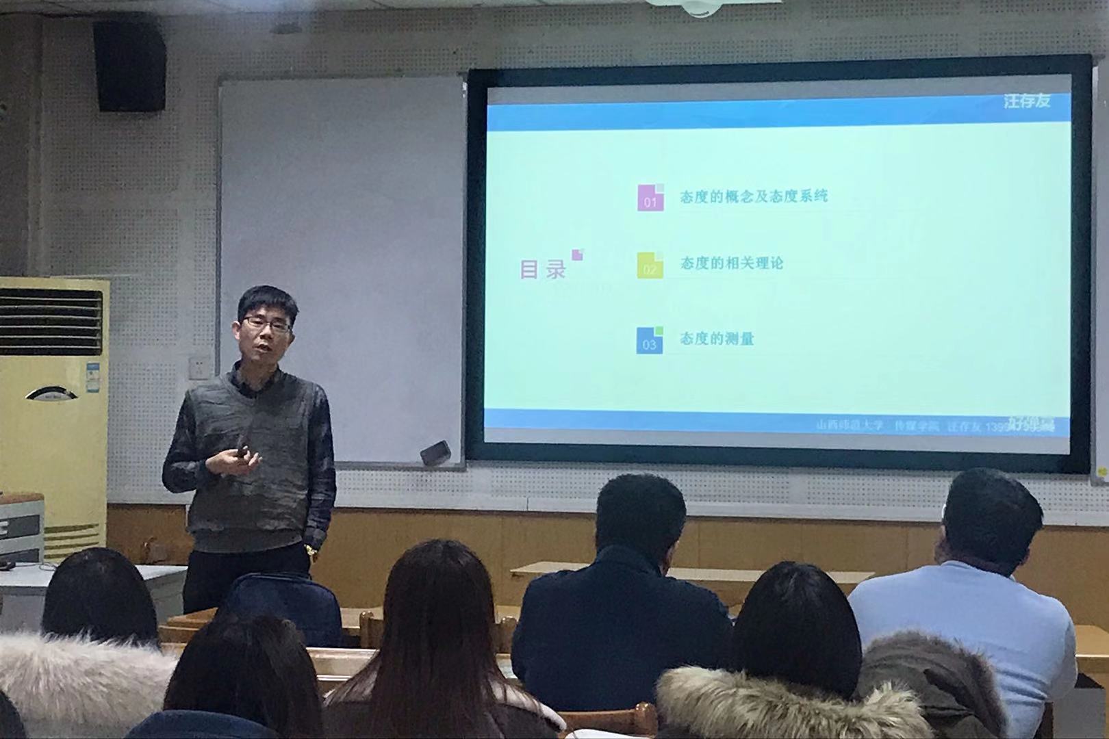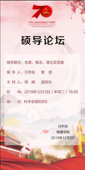 2019年12月3日19点,emc易倍在科学会堂B305举办了2019-2020年度第一期硕导论坛。硕导论坛旨在搭建硕士研究生导师、青年教师与员工之间的交流平台,为公司青年教师提供学习机会,为研究生毕业论文开题开阔学术视野、提供科研思路。此次论坛邀请公司副经理、硕士研究生导师汪存友教授,作题为《态度:概念,理论及测量》的报告。emc易倍副经理周婧、部分青年教师及全体研究生参加此次论坛,论坛由副经理周婧主持。