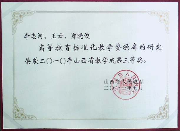 公司教师获得2010年山西省教学成果三等奖,获奖成果是山西省教育科学“十一”五规划课题:高等公司产品资源库设计与开发以及山西师大本科教学质量工程教改重点课题:高等教育标准化教学资源库的研究的最终研究成果。课题的主要成员包括:李志河(课题负责人)、王云以及郑晓俊。